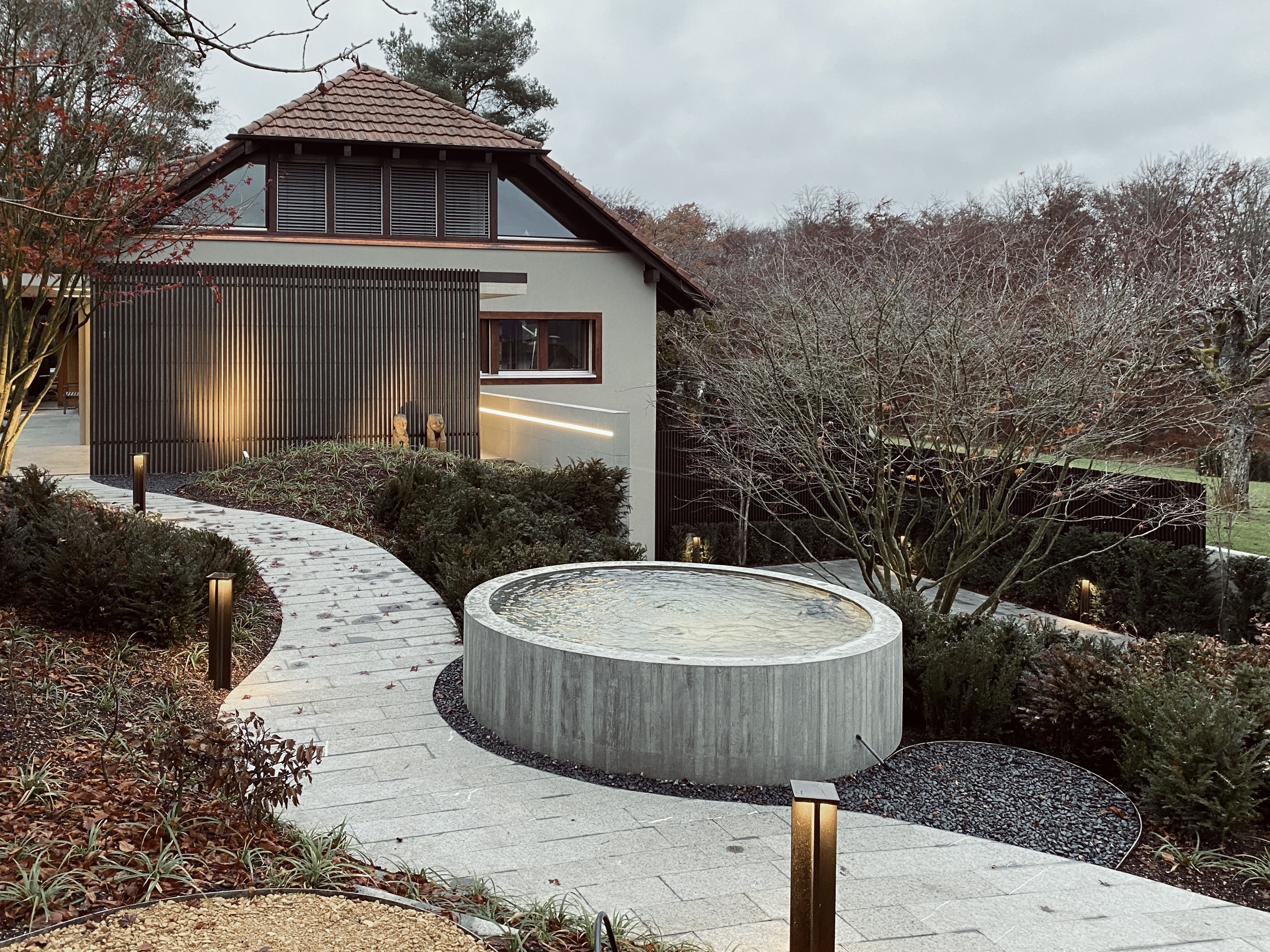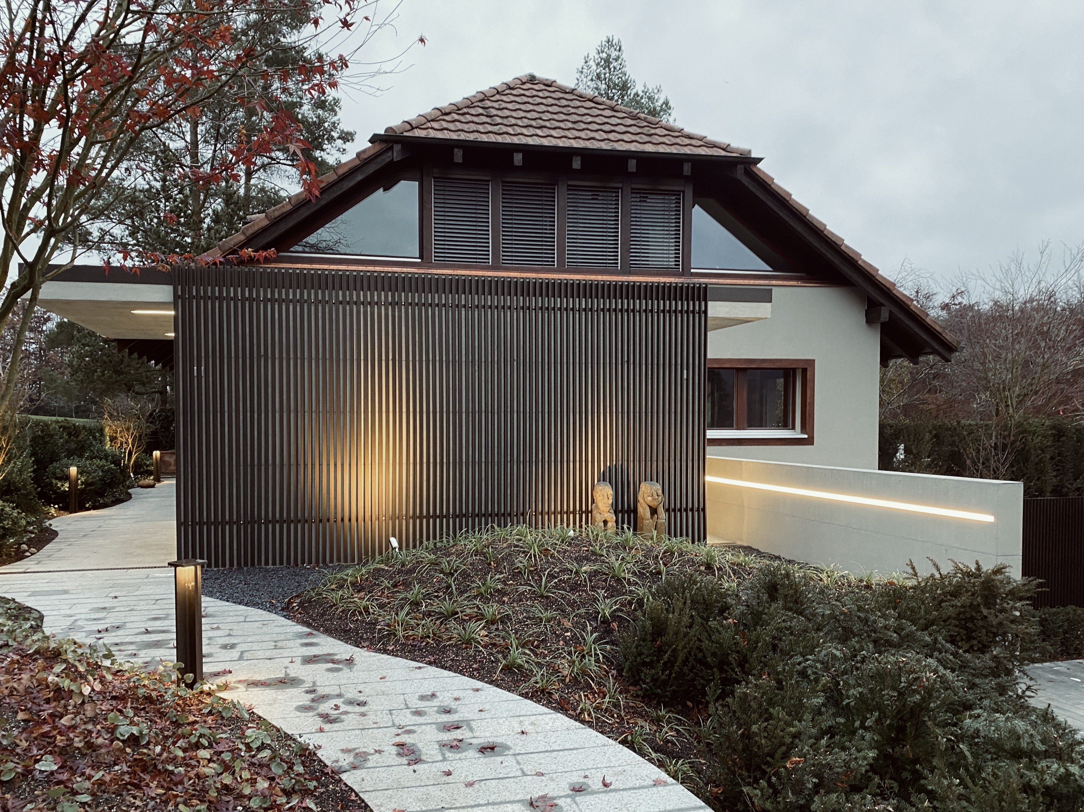 Dass bereits kleine Eingriffe – unter der Wahrung des Charakters – grosse Wirkung erzielen können, beweist dieser gelungene Anbau. Der markante, von Lichtbändern durchzogene Unterstand verbindet sich ganz selbstverständlich mit der optimierten Fassade des Landhauses und präsentiert sich in der neugestalteten Umgebung von seiner besten Seite. Im gleichen Zug mit den äusseren Veränderungen wurden im Untergeschoss ein freundliches Bad sowie ein geschmackvolles Gästezimmer realisiert.